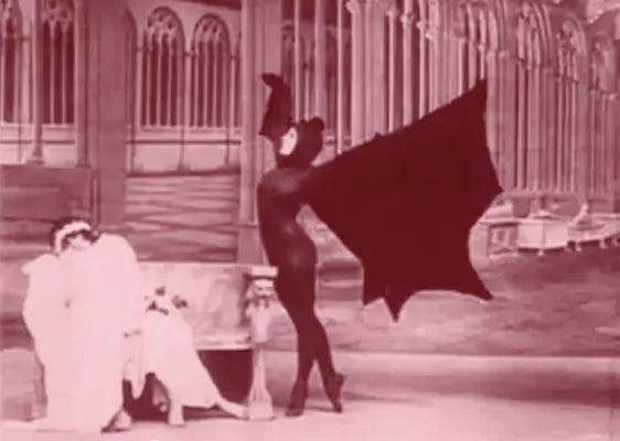 同时,默片中出现的红色和蓝色“滤镜”,实际是双色染色 / 双色调(Tinting & Toning)+ 遮罩(Matte)叠加,在没有色彩的年代用来体现不同时空与表达不同情绪。路易斯·弗伊拉德的《吸血鬼》便是这种技术的代表作,使用四种颜色区分夜晚与白天。后来阿萨亚斯与张曼玉合作的《迷离劫》又致敬了《吸血鬼》中的女贼形象。